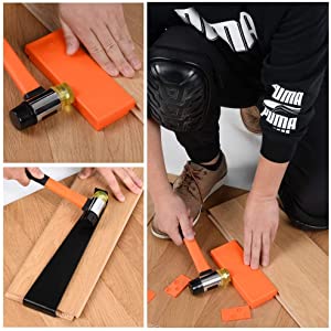 It comes with a tapping block, pull bar, mallet and 20 spacers - making it easy to eliminate gaps on the long side of the planks, insert the tapping block into the tongue of the plank when tapping two planks together, adjust the thickness of the gap using two spacers and use the mallet to hammer the tapping block to eliminate gaps between planks.