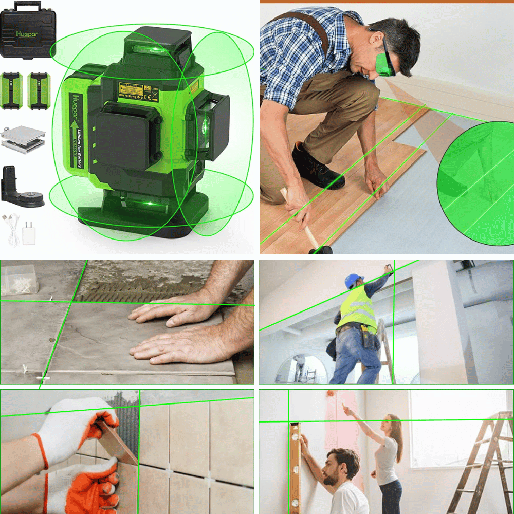 The Huepar 4x360 Laser Level Self-Leveling 16 Lines Green Beam 4D Cross Line is the perfect tiling floor laser tool for all of your projects. It provides four 360° planes of laser light, with the top 360° horizontal line for ceiling installation and the 360° floor horizontal line for tiling installation.