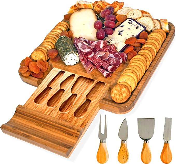Highlight the distinct and luxurious look of this Bamboo Cheese and Charcuterie Board Set that, is sure to impress all the guests in any gathering! It comes with two cheese knives, two glass bowls for condiments, and two charcuterie knives to serve delicious appetizers.