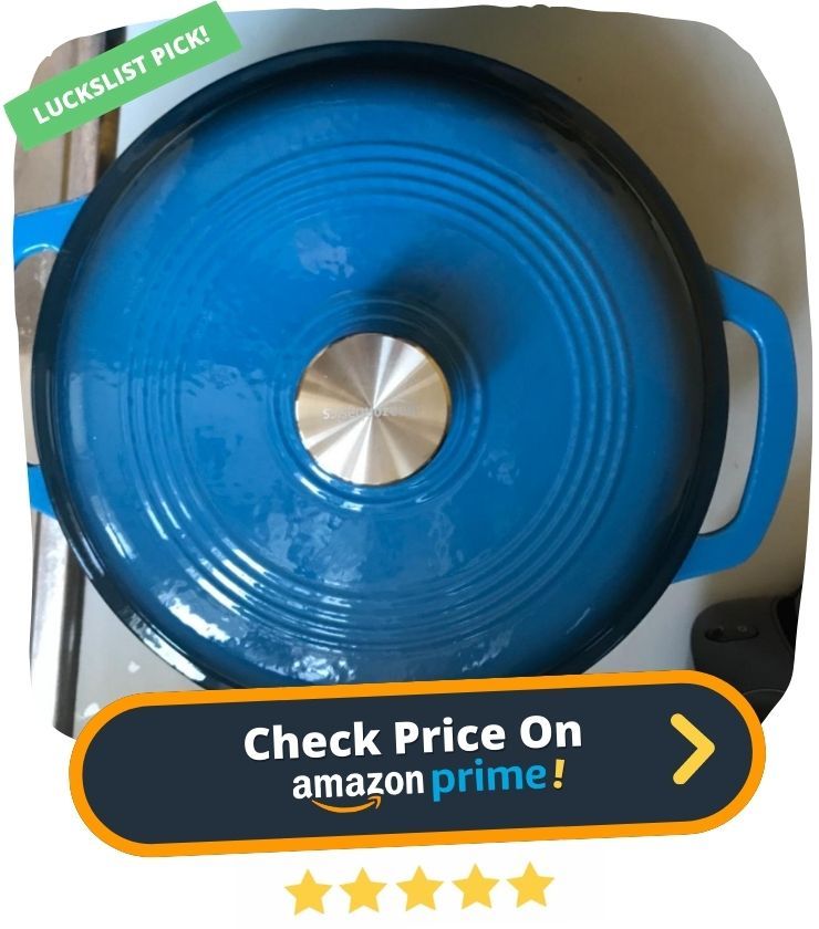 13. Introducing the Amazon Basics Enameled Cast Iron Covered Dutch Oven. This 6-quart pot is perfect for cooking and baking in the oven or on the stovetop. The smooth enamel finish provides long-lasting durability and non-stick convenience, while the cast iron provides even heat distribution and retention. The dual side handles and fitted lid make it easy to transport and use, and the pot is oven safe up to 400 degrees Fahrenheit.