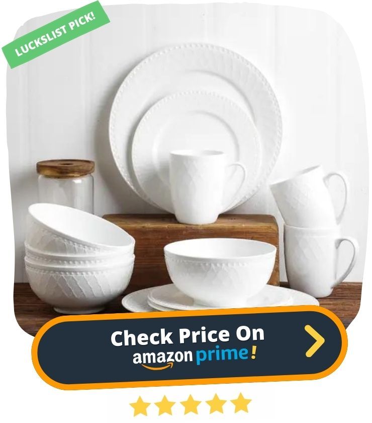 8. The Stone Lain Bone China Basket Weave Embossed 16-Piece Dinnerware Set is a gorgeous set of plates, bowls and cups that will make your table look simply elegant. This complete dinner set for four features basket weave designed plates, bowls and mugs in a beautiful bone china. The material is made of refined bone china and is 100% dishwasher and microwave safe, making it durable and easy to care for.