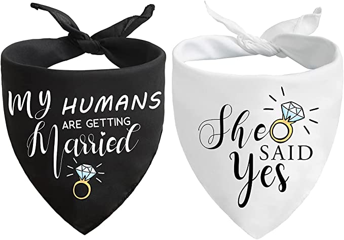 Introducing the She Said Yes Dog Bandana! The perfect gift for that special someone in your life who just got engaged. This beautiful bandana features a pretty white and gold design with the words "She Said Yes" in a fun, stylish font. It's made of 100% cotton and is machine washable, so it's as practical as it is lovely. Plus, it's adjustable so it can fit any size dog.