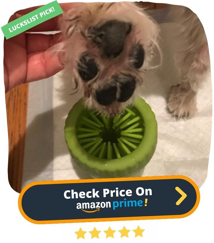 "My 15 lbs mini Schnauzer pup gets really muddy paws at the dog park. This thing does the job with minimal mess …especially compared to trying to give him a bath or wash his paws outside with a hose. He doesn’t mind the device much but it does work a bit easier with two people."