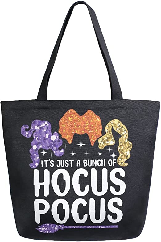 What's better than a little Hocus Pocus to get you into the Halloween spirit? This fun and festive witch-themed-movie tote bag is perfect for carrying all your Halloween goodies, and it's sure to put a smile on any Witch's face. The black canvas bag is covered in sparkling glitter that catches the light, and it's adorned with a colorful Hocus Pocus design.