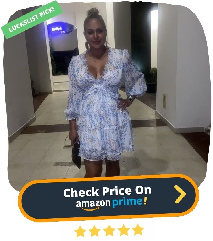 5. Looking for a fun and flirty dress to wear on your next night out? Look no further than the Dokotoo Women's Deep V Neck Dress. This pretty mini dress features a deep v neckline with cut-out detail, full length flared sleeves, and ruffle trim detail. The button closure at the back neck adds a touch of elegance, while the keyhole detail keeps things fun and flirtatious.