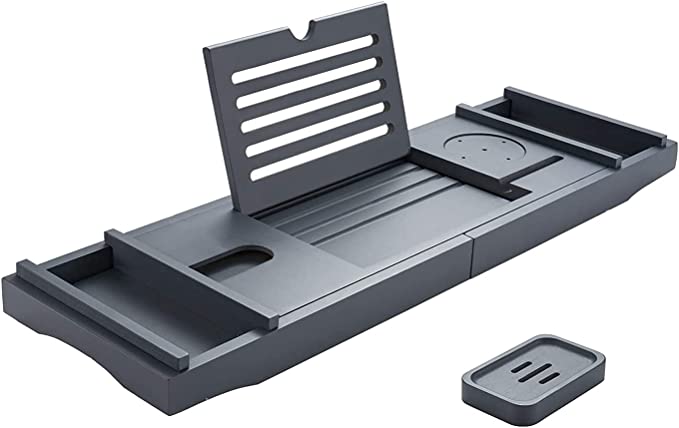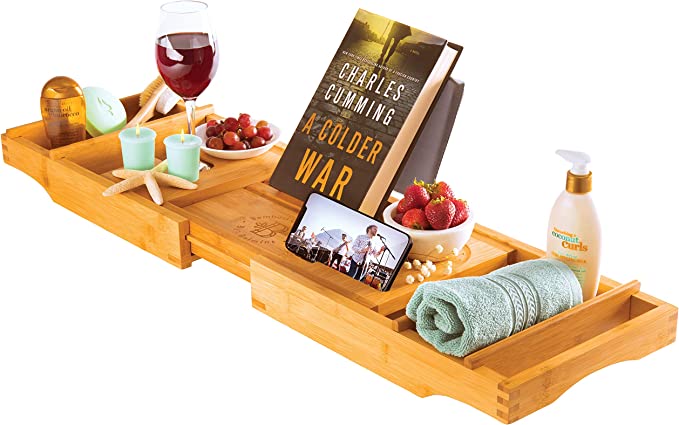 This bathtub caddy tray is the perfect gift for anyone who loves to relax in a nice hot bath. It is made of high-quality materials and features a beautiful design that will look great in any bathroom. The caddy tray includes a book holder, wine glass holder, and cell phone holder, so you can enjoy your bath time even more.