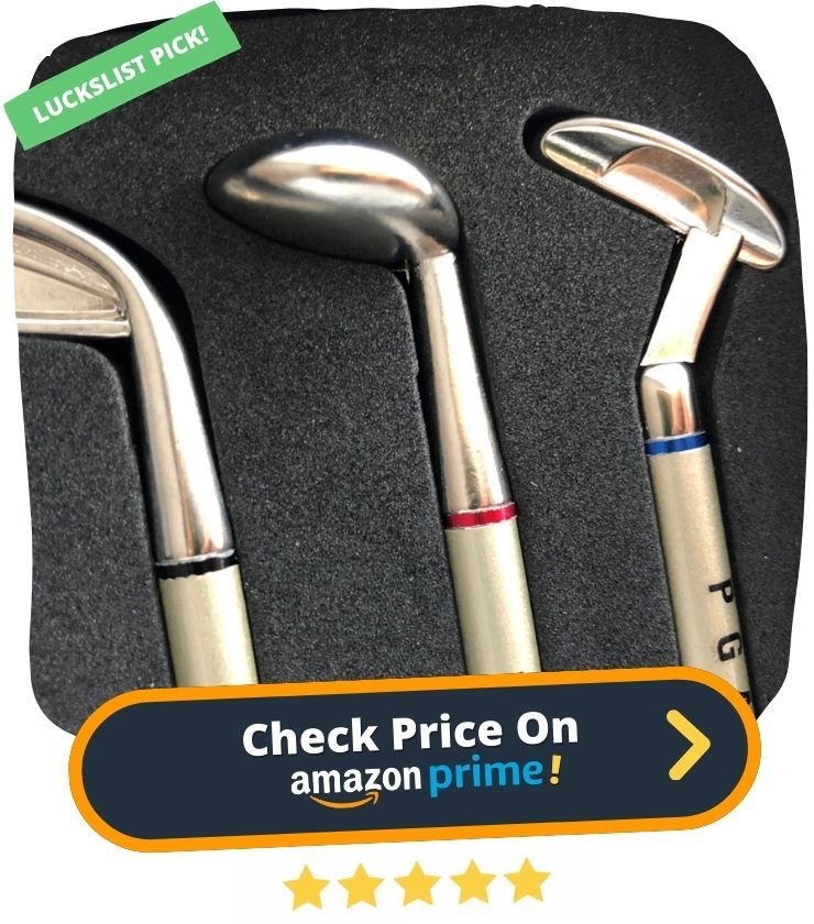 6. The PGA Tour 3 Piece Golf Pen Gift Set is a great way to add some fun to your desktop putting. This set of three golf club ballpoint pens comes with a driver in red, an iron in black, and a putter in blue. Each pen has a golf grip lid for a comfortable grip. This makes a perfect stationary set for any golfer and comes packaged in a presentable gift box.