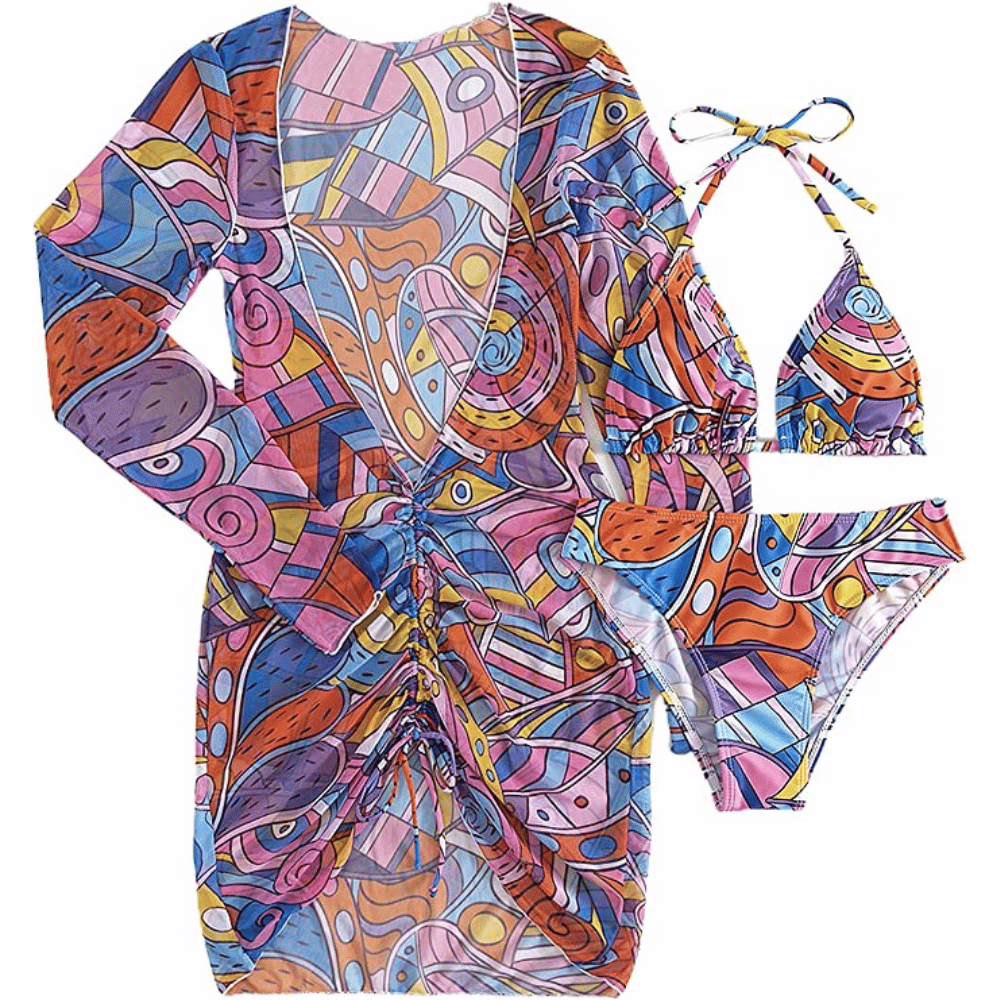 If you're looking for the perfect swimsuit for your summer beach looks, this 3-piece bikini sets with a tie closure and tie back is exactly what you need. Not only does it have a unique halter, and triangle top design but also comes with a long sleeve cover-up.