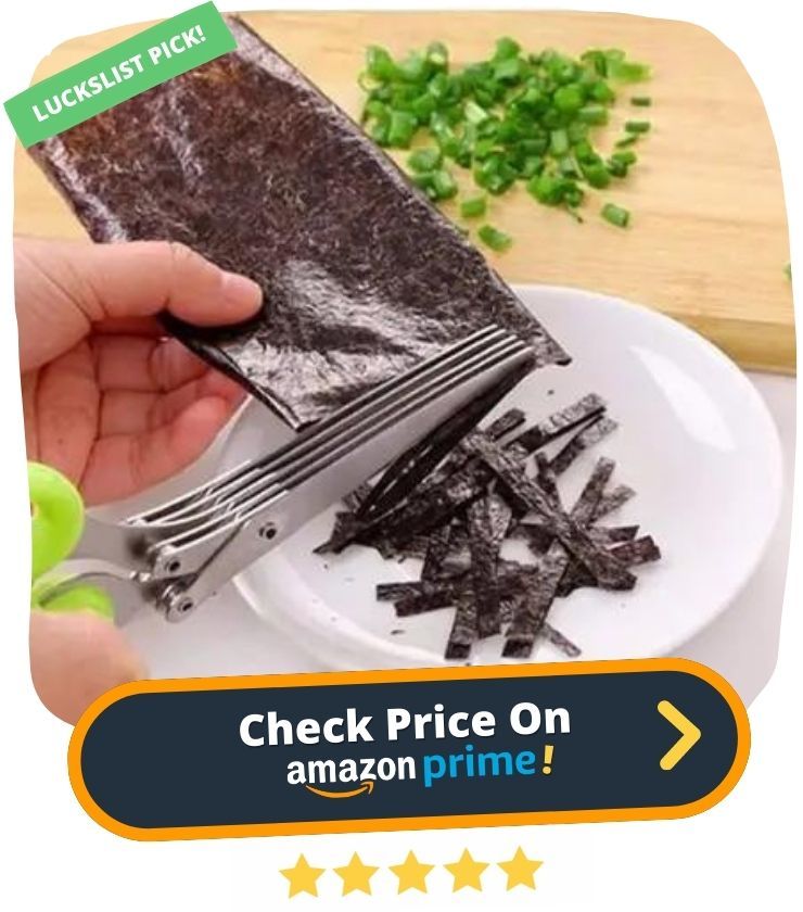 19. With a superior 5-layer stainless steel blade, this Nuoshen kitchen scissor is built for durability and performance. The serrated edges make it easy to cut through herbs, onions, chili, seaweed, and other seasoning with ease – and it can even handle paper with ease.