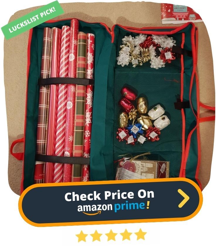 9. Looking for a stylish and practical way to store your gift wrapping supplies? Look no further than the Wrap Fabric Storage Bag! This handy storage bag is made from durable fabric in a festive green and red colour scheme, and features carrying handles and a zip closure to keep everything safely stored away.