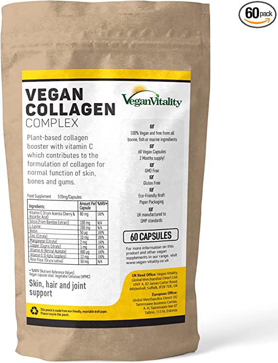 Are you looking to reinvigorate your skin, hair, nails, bones and joints? Our Vegan Vitality Vegan Collagen Supplement is the perfect solution! Loaded with natural plant based extracts like Acerola Cherry and Bamboo, along with L-Lysine, Biotin and 5 essential vitamins, our supplement helps reverse collagen production decrease as we age. Plus – it’s 100% vegan and free from bovine, fish or marine ingredients! You need not worry about compromising your beliefs in opting for a natural and sustainable way to strengthen your health.