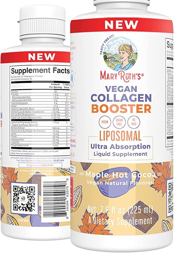 Introducing MaryRuth Organics Collagen Booster Liposomal; the delicious, nourishing solution to keeping your bones and skin healthy! This vegan blend of five vital amino acids and vitamins C & E, zinc, copper, and silica is a powerhouse for collagen production. With our specially formulated liposomal delivery system, you can enjoy improved absorption compared to less bioavailable options. Enjoy the added benefit of a delicious maple hot cocoa flavor - without sacrificing optimal nutrition!