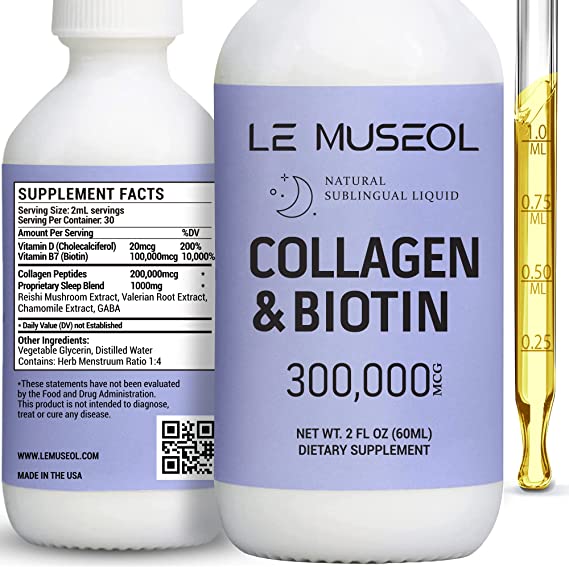Do you feel like you deserve to look and feel your best at any age? If so, Le Museol Liquid Collagen is the answer. This powerful blend of natural ingredients helps restore collagen levels so that you can have youthful glowing skin and hair each morning. Made with 300,000mcg of collagen peptides and biotin, Le Museol supports healthy skin hydration and elasticity while reducing the appearance of dry lines for plump skin. Biotin helps promote healthy hair growth as well as beautiful nails too. But that's not all! Our unique Herbal Synergy Blend features Reishi extract, Chamomile, Valerian root and Gaba supplements to help keep your body feeling refreshed after a good night's sleep.