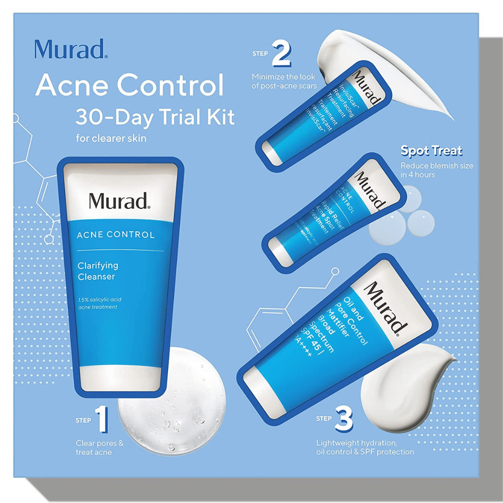 Murad Acne Control Kit is a 30-day trial breakout skin care kit with InvisiScar Resurfacing Treatment, Facial Cleanser, Acne Clarifying Treatment and Facial Moisturizer for blemish and breakout prone skin.