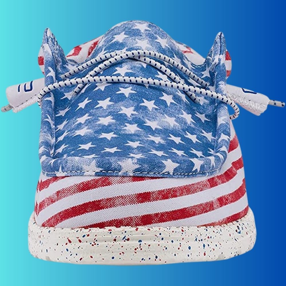 The Hey Dude's Stars N Stripes Wally Collection is also designed with travel in mind. The removable memory foam cushioned insole reduces sweating and odors, allowing you to wear them for extended periods. These shoes are also machine washable, so you can keep them clean easily.