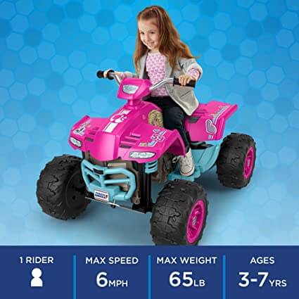 The Power Wheels Barbie Pink Racing ATV is the perfect vehicle for your little princess. This battery-powered, ride-on ATV features Barbie graphics and drives up to 6 mph (9.6 km/h) on hard surfaces, grass, and other rough terrains.