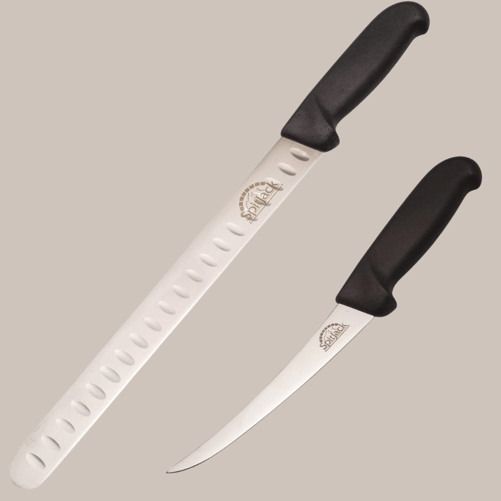 SpitJack BBQ Knife Bundle is Amazon’s Choice for BBQ knives and is the perfect tool for trimming and slicing meats. The set includes a 6" trimming and boning knife as well as an 11" meat slicing knife.