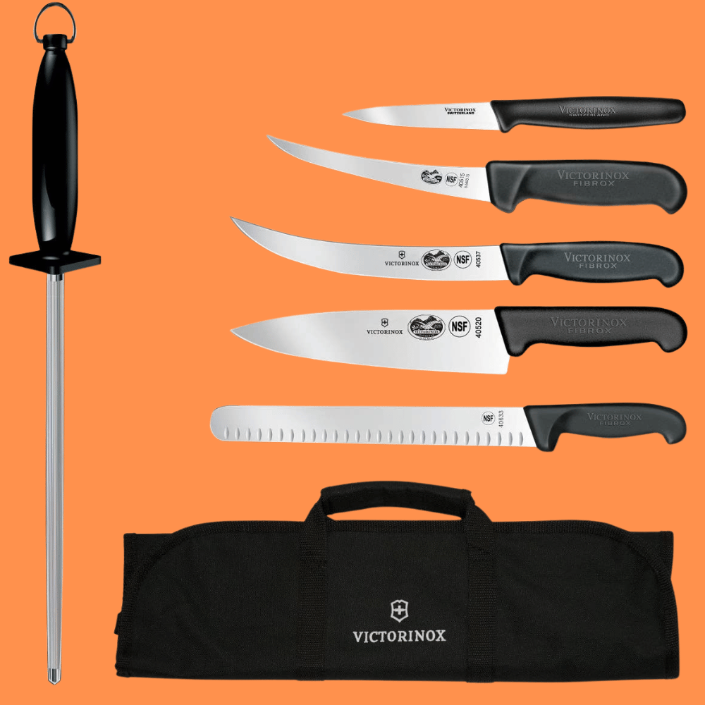 The set includes a spear point paring knife, boning knife, chef's knife, breaking knife, Granton slicer, regular cut steel, as well as a knife roll bag for easy travel. Furthermore, the ergonomic Fibrox Pro handle with non-slip grip and comfort provides an optimal cutting experience.