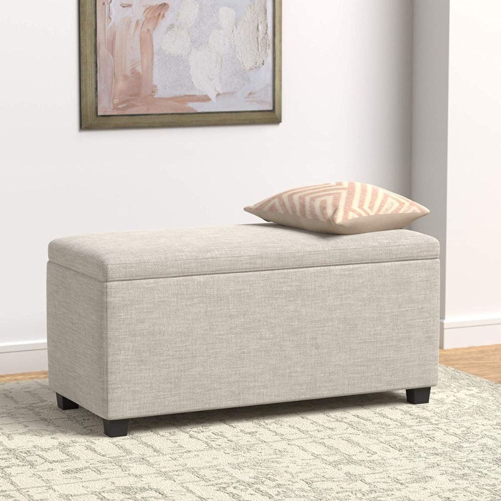 The Amazon Basics Storage Ottoman is the perfect solution for extra seating and storage. This bench style ottoman features an interior storage compartment and is made with a hard wood frame, sturdy plastic feet, and beige fabric upholstery.