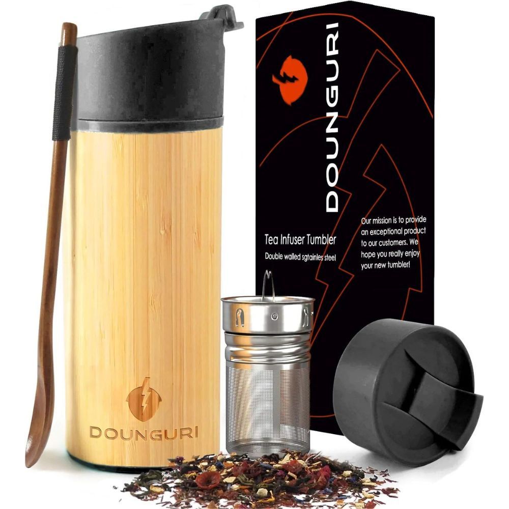 The Dounguri Bamboo Tea Tumbler Mug with Strainer Infuser is made of high-quality bamboo and stainless steel, making it durable and long-lasting. This also features a built-in strainer so this bamboo tumbler infuser can easily steep your favorite tea, coffee, or fruit-infused drinks. Plus, it has double-walled insulation that will keep your drinks at the perfect temperature for hours. So why wait? Get the Dounguri Bamboo Tea Tumbler Mug with Strainer Infuser today!