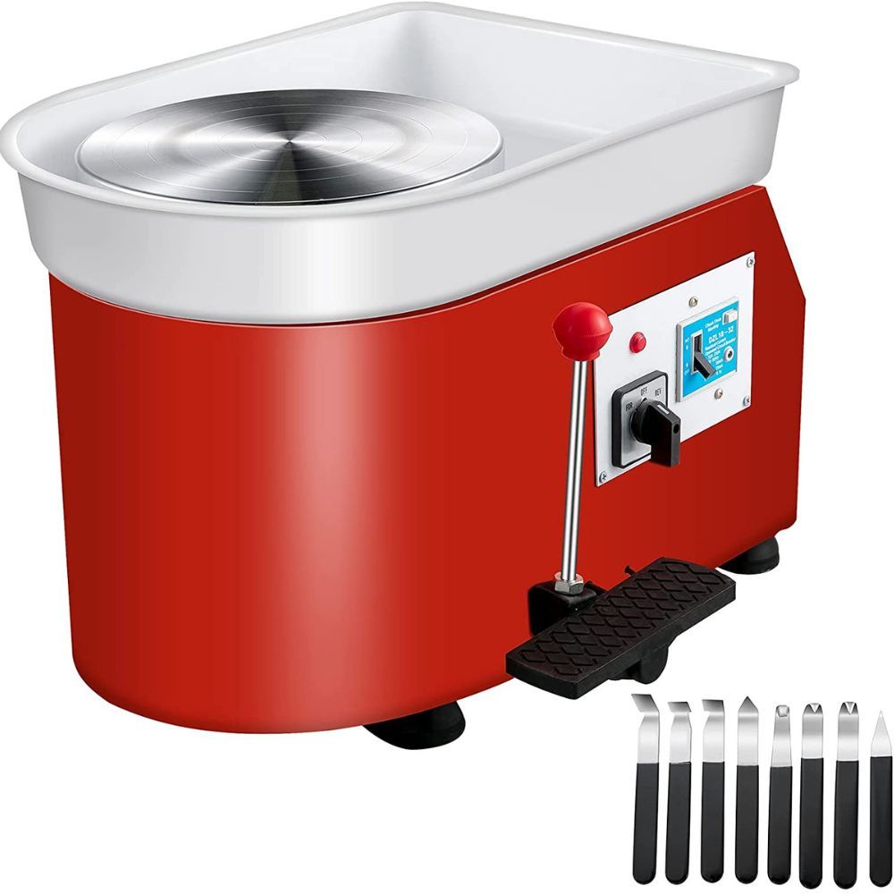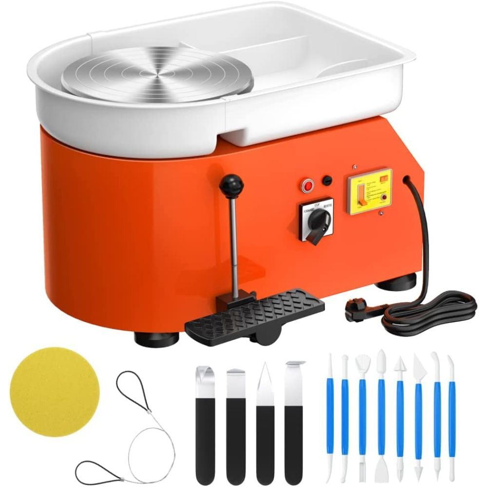 The Mophorn Pottery Wheel is made with a spray-treated machine body and a compact structure with humanized design and outstanding details. It also comes with a set of shaping tools and an easy-to-clean ABS basin for a more enjoyable experience.