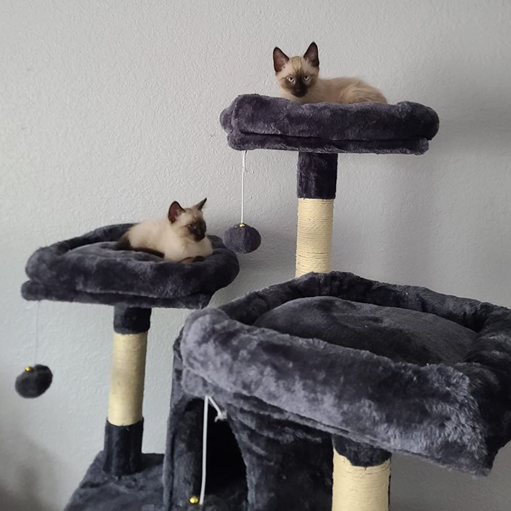 The jingly balls and sisal-covered slope add even more fun for your cats, making this cat tree a great investment for multi-cat homes. The Hey-Brother Cat Tree is an ideal spot for your cats to lounge, jump, climb, play, and claim as their own! So, If you have multiple cats in your home, The Hey-Brother Cat Tree is a great choice.