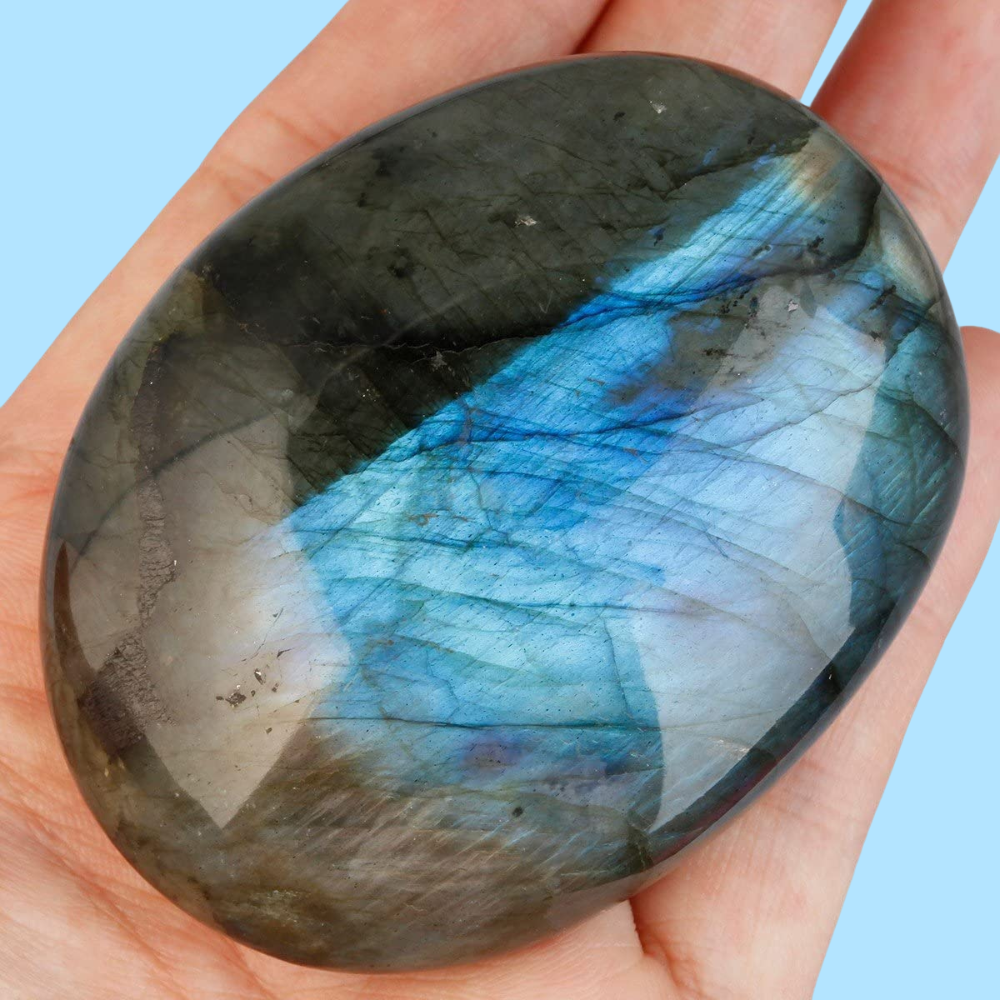 Enhance your crystal collection with the mesmerizing beauty of Labradorite Palm Stones! Hand-carved from natural labradorite, each stone showcases its own unique pattern and color. These polished stones fit perfectly in the palm of your hand and are super smooth to touch. Not only do they make a great gift but also act as an ideal aid for relaxation and anxiety relief. Moreover, labradorite has healing properties to help calm the mind, body, and spirit, making them even more precious! Every purchase comes with a luxurious black velvet gift bag, too, to help you keep your gem safe and secure. If you're a crystal collector, these stones are the perfect addition to your collection. Get your hands on one today and start the journey of discovering inner peace with labradorite!