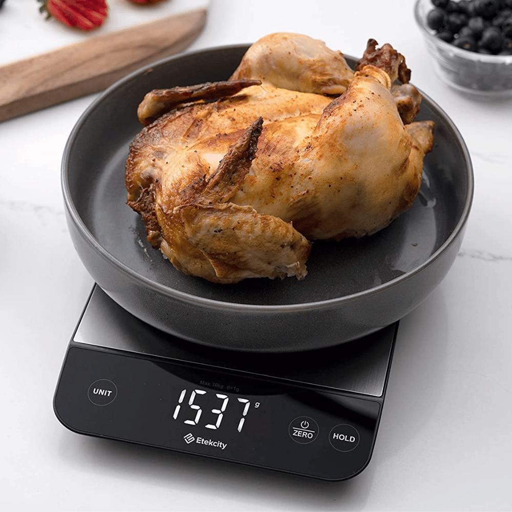 If you're looking for an accurate, budget-friendly food scale that offers all the features of a top-of-the-line model, then the Etekcity Luminary 22lb (9.98 kg) Digital Scale is perfect. It's waterproof, rechargeable, and has multiple helpful functions like tare and hold.