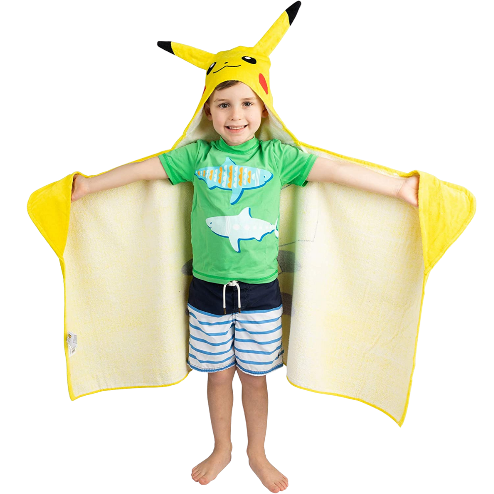 Give the gift of adventure to your favorite Pokémon fan with this delightful Pikachu hooded towel wrap! Crafted from premium quality cotton terry, it ensures warmth and coziness for children. As an added bonus, its highly absorbent material helps kids dry up quickly after swimming or showering as well. Not only that; its 3D ears and Pikachu character design make it a great accessory indoors or outdoors, whether at home, in the bathroom, at the beach, poolside, or more! Plus, two corner pockets let little ones keep their cool while wearing this awesome towel! If you're seeking a unique gift for kids, this is it!