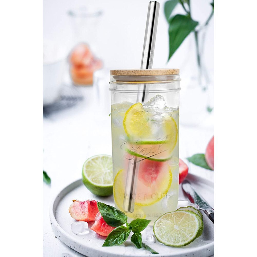 The Mason Jar with Lids and Straws set includes 2 mason jars (24oz), 2 bamboo lids with straw holes, a set of stainless steel straws, and a straw cleaning brush. The material of the wide-mouth mason jar lids meets safety standards and is free of BPA, phthalate, and PVC. Plus, each mason jar drinking glass is fitted with a pure natural bamboo lid that will not deform. To ensure that the lid stays in and not popping off, make sure the silicone ring stays in the groove and push the lid in and rotate it three times before each use.