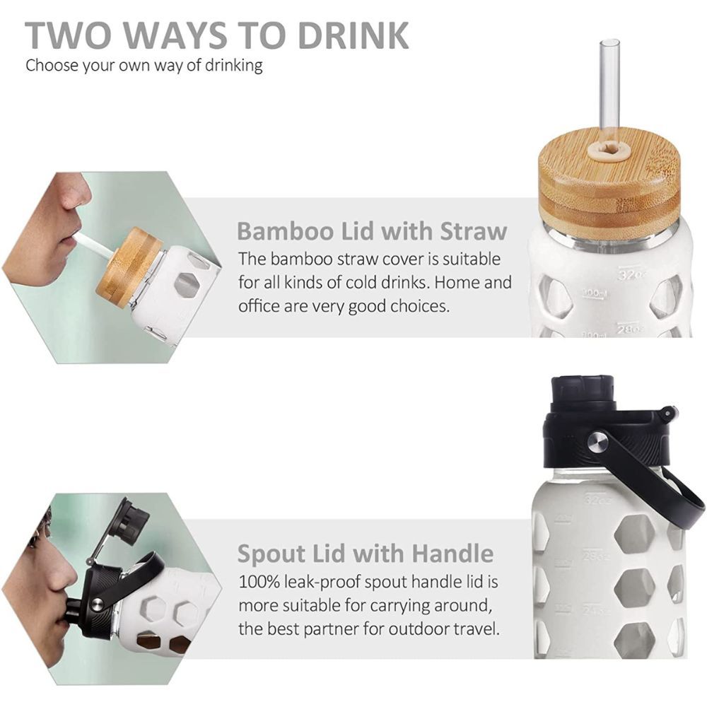 The MUKOKO 32oz Glass Water Bottle is the perfect way to stay hydrated on the go. The lid with a drinking spout and handle is 100% leakproof, and the bamboo lid is stylish and functional. The glass is made of durable borosilicate glass and is wrapped in a silicone sleeve for a better grip. Plus, it's BPA-free, dishwasher-safe, and free from chemical odors or tastes. So why wait? Order the MUKOKO 32oz Glass Water Bottle with 2 Lids today!