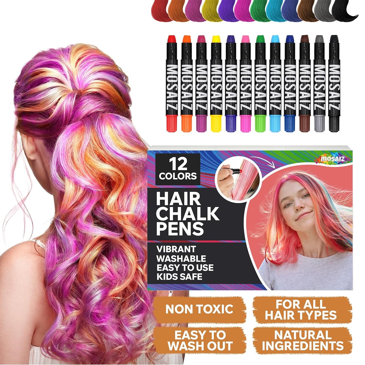 Hair chalk is a type of temporary hair color that is super easy to apply directly to dry hair. It typically comes in the form of a chalk stick, pencil, wax, cream, hair chalk compact, or spray and can be used to create various colors and designs on the hair. Simply rub the color on your dry hair. Most chalks are non toxic and can be washed out super easy in one shampoo.