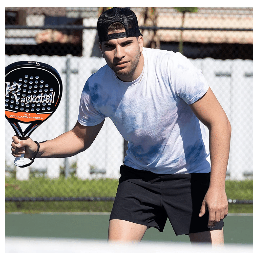RAYKOBELL Padel Racket is a must-have for all Padel tennis players. This paddle tennis racket is constructed from 100% carbon fiber, making it lightweight, durable and resistant, superior to other beach tennis rackets.