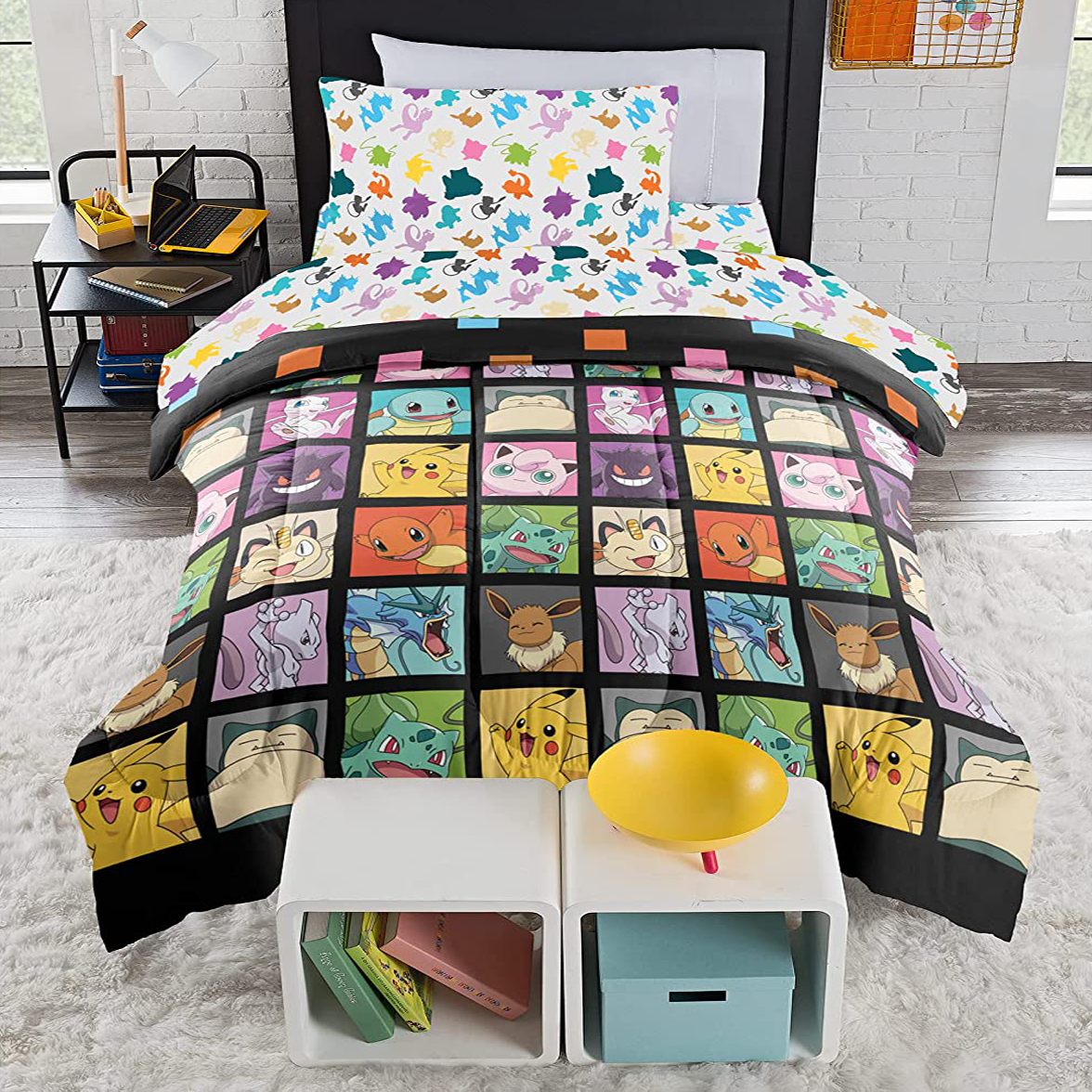 Kids will love cuddling up in this Pokémon Kanto Favorites Twin Bed Set! Featuring original Pokémon characters, Pikachu, Charmander, Squirtle, and many more in a grid pattern, this bed set is sure to bring a smile to your child's face. Made of 100% polyester, this set is soft and cozy, and includes one heavy weight comforter, one flat sheet, one fitted sheet and one pillowcase. Plus, it's Amazon's Choice for Pokémon bedding twin set, so you can trust that your child is getting the best of the best!