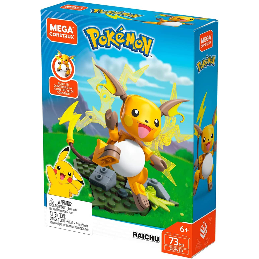 Pokémon fans, you'll love the Raichu MEGA Building Set! This set includes 73 pieces to make your own articulated figure with arms, legs, head and ears. Not only that - it also features a lightning tail activated by hand plus an electrifying transparent battle effect detail. Adding more fun to this package is its buildable environment which doubles as a display stand so you can proudly show off your masterpiece! Top it all up by combining other Pokémon construction sets from Mega Construx and watch your magical world of Pokémon come alive right before your eyes! So, what are you waiting for? Get your Raichu MEGA Building Set today!