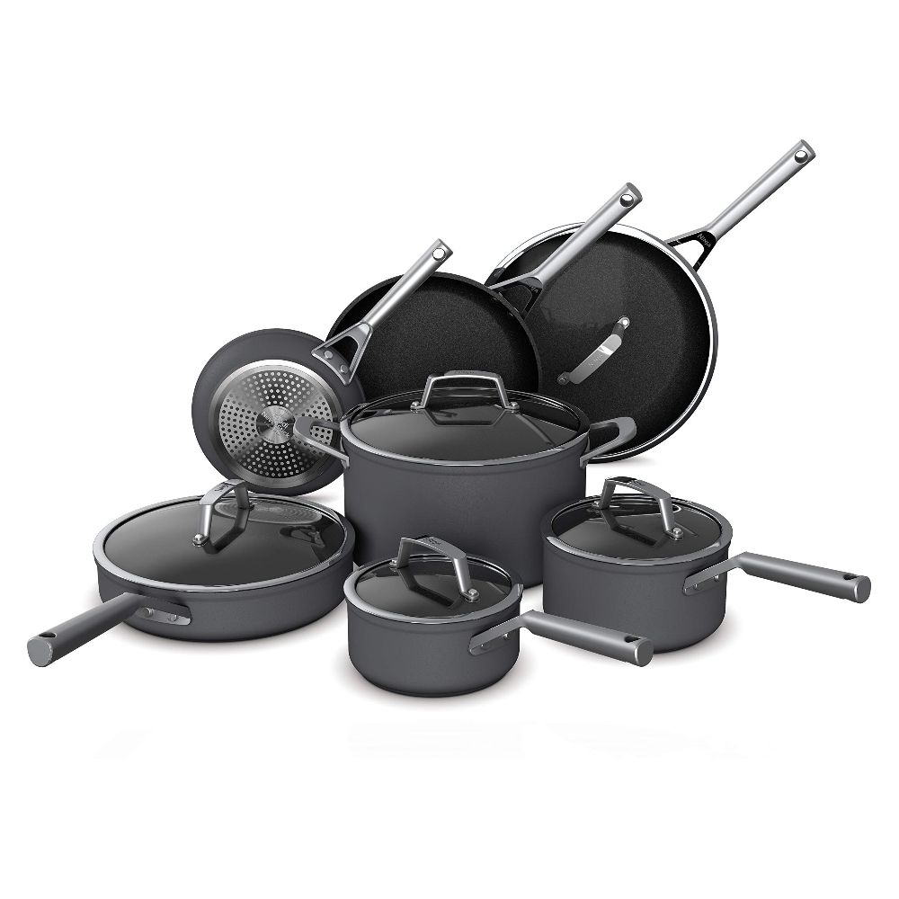 The set is made from hard-anodized aluminum, which ensures even heat distribution and superior durability. Plus, the nonstick coating is specially designed to be super-heated and won't chip, flake, or stick.