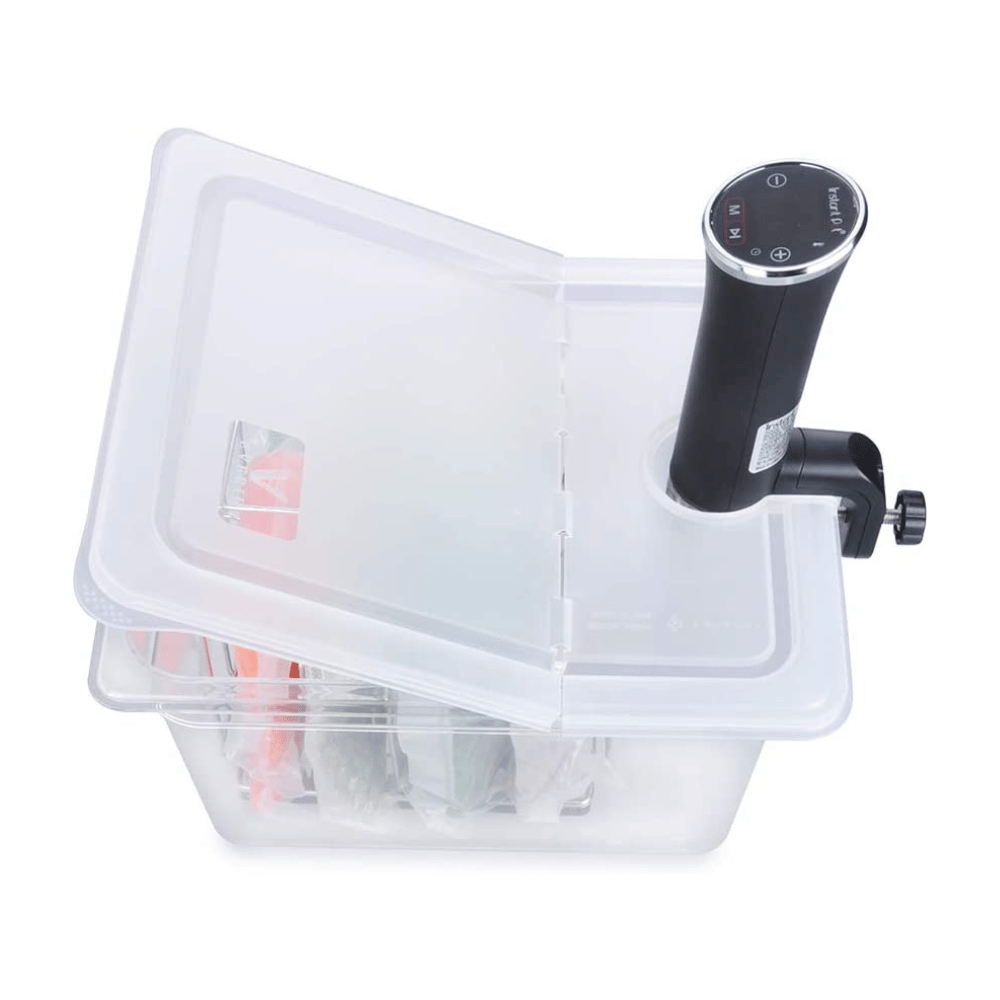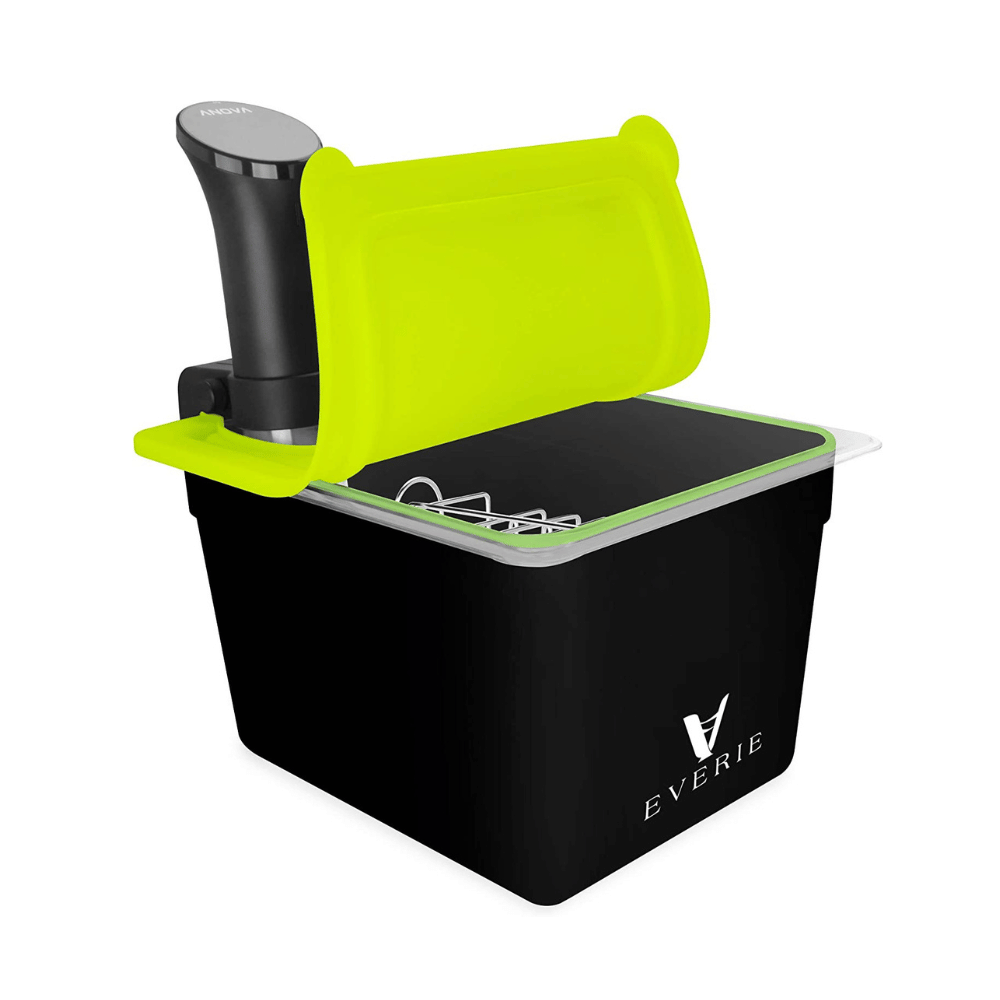 The Everie Sous Vide equipment bundle is the perfect accessory for any Anova Nano 750w or An500-US00 1000w cooker. This 12-quart container comes with a hinged lid to minimize water evaporation and heat loss, so you can sous vide cook overnight without worrying about your minimum water depth.