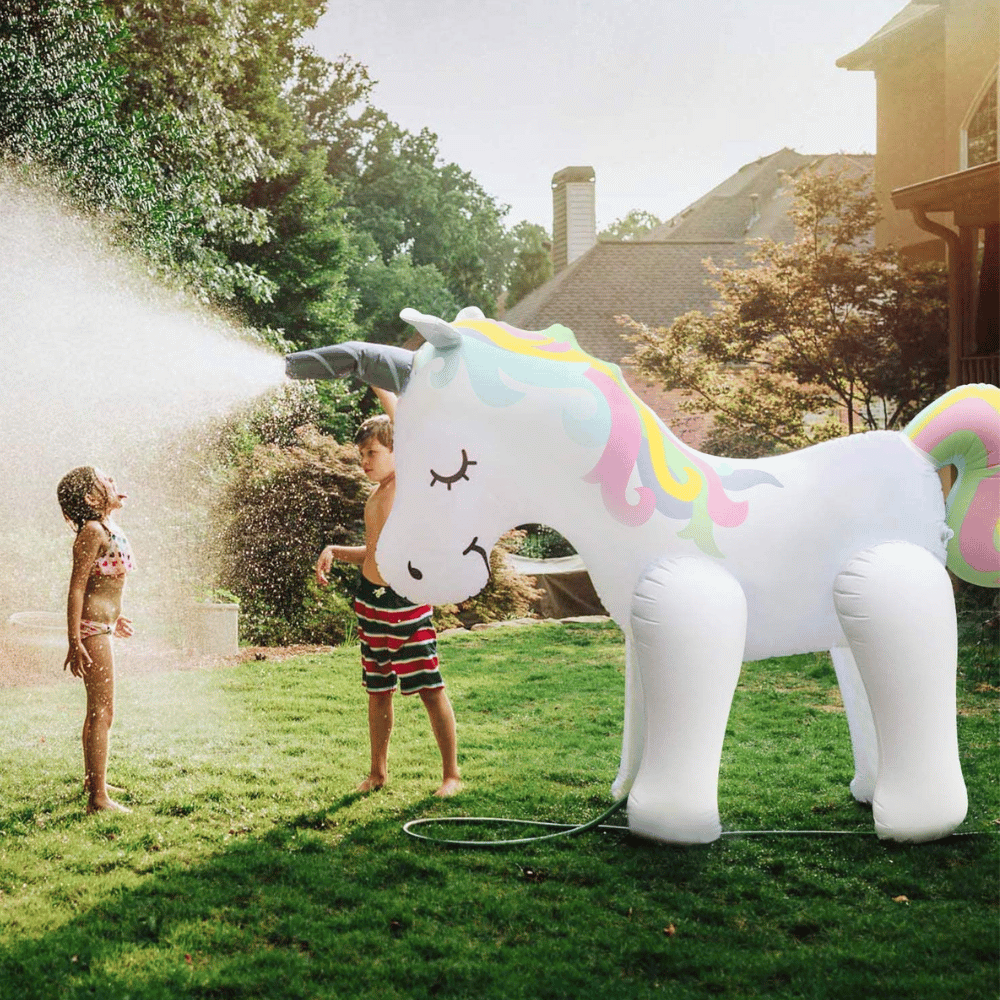The Float Joy Giant Inflatable Unicorn Sprinkler is the perfect addition to your kid's next party. It's over 5ft tall after inflated and comes with a pump in case you need to inflate it.