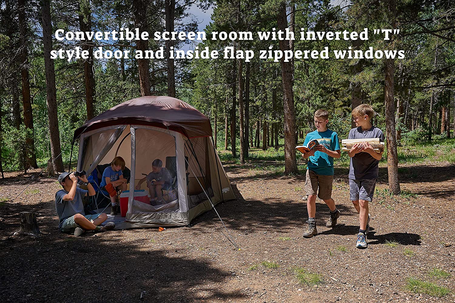 It offers plenty of headroom and features removable seam-sealed fly and mesh roof vents to ensure optimal ventilation. Additionally, the tent has zippered side windows with inside flaps that offer privacy while providing plenty of natural light. Plus, this camping tent is incredibly easy to set up thanks to its shock-corded fiberglass roof frame with steel uprights and corner elbows combined with a pin and ring system.
