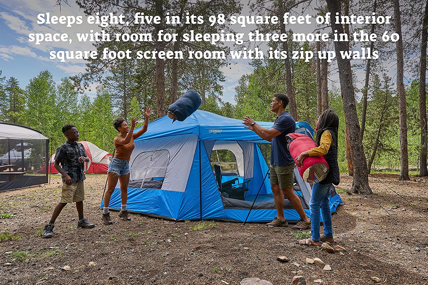 It features a separate screen room for insect-less lounging and extra sleeping space, as well as the patented WeatherTec system with a rainfly that shields you from the elements. Plus, its Fast Pitch design sets up in about 7 minutes, so you'll be able to enjoy your trip with your pup in no time. However, it is important to note that the tent only accommodates two queen-sized airbeds.