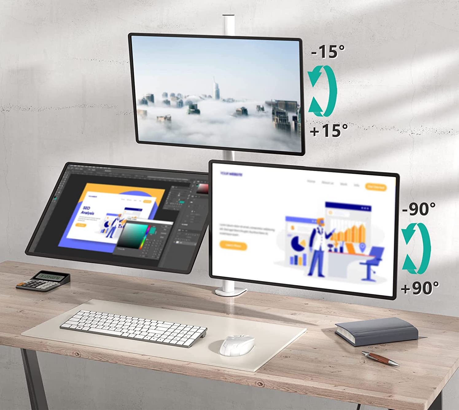 The Mount-It! Triple Monitor Mount is the perfect solution for getting the most out of three monitors. It's easy to install, and the outer arms can tilt up and down 90 degrees, swivel 360 degrees left and right, and raise and lower.
