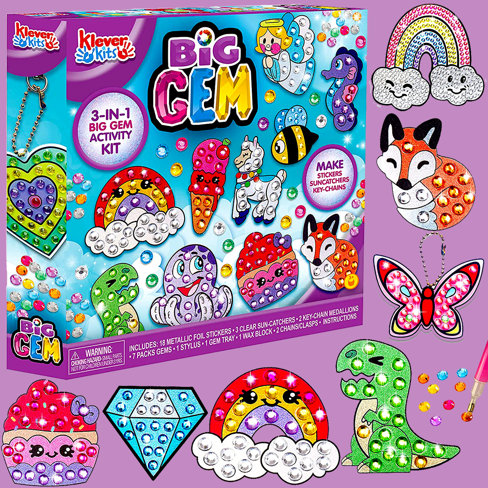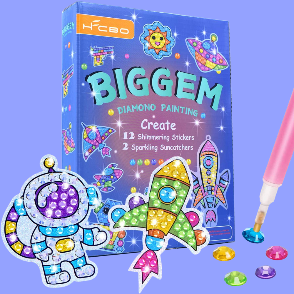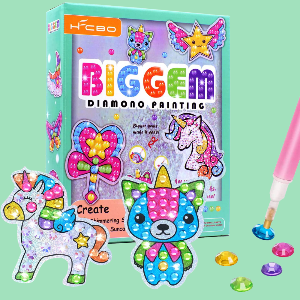 Inspire your child's creativity with the Big Gem Diamond Painting Kit! Not only will they have a blast creating beautiful diamond art, but it will also help to boost their confidence. This kit is packed full of everything you need: sparkling diamonds, holographic stickers and suncatchers, keychains, wax and more! Plus, this premium quality set has been safety approved so you can be sure that your little one is playing in complete security. Perfect for developing various skills, from hand-eye coordination to fine motor skills, it's the perfect way to spend quality time together. Get ready for hours of fun with the Big Gem Diamond Painting Craft Kit and bring home your own masterpiece!