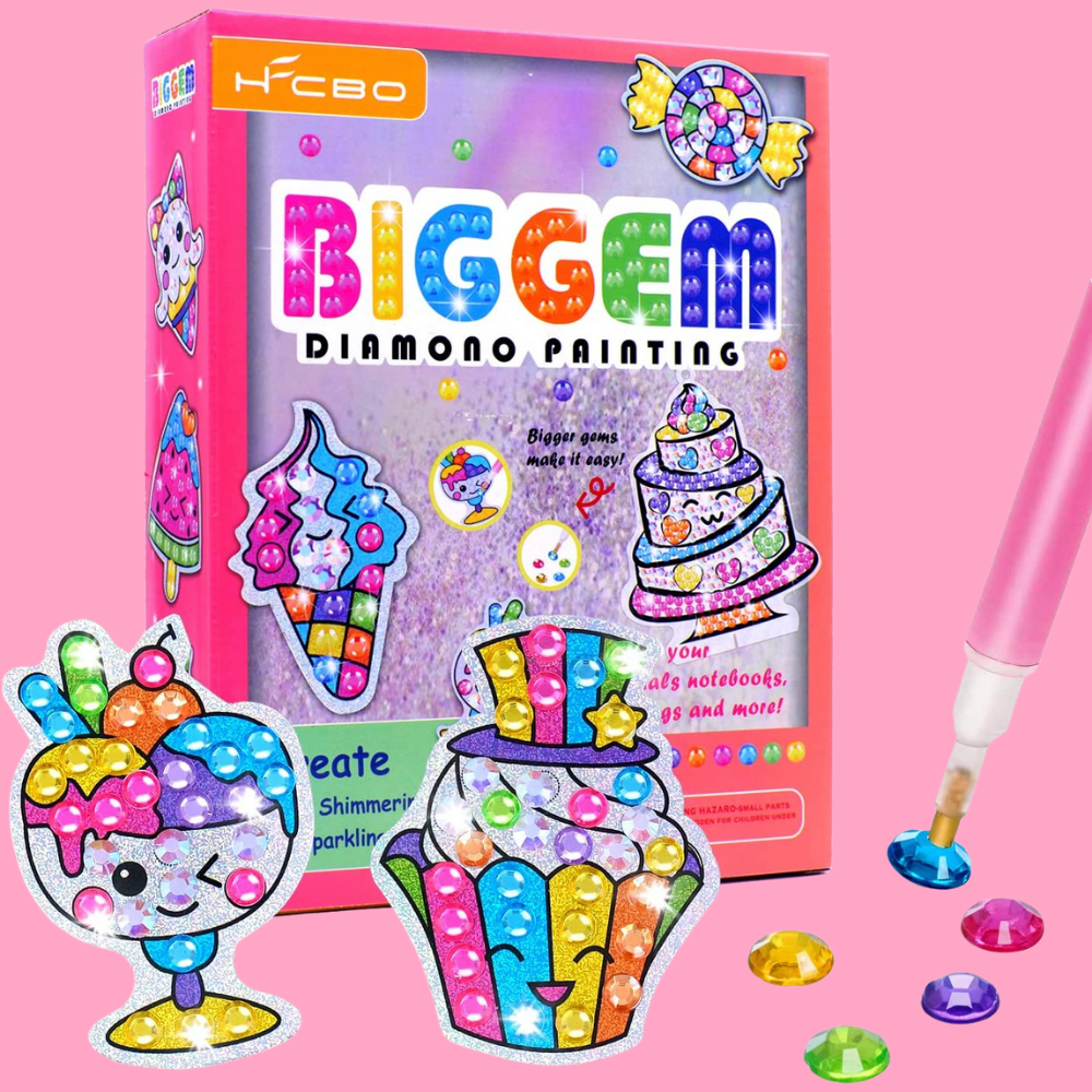 The Big Gem Diamond Painting Sweets Kit is the perfect way to unleash your creativity while having fun! With this complete kit, you'll get two diamond art activities in one. Not only will there be twelve holographic stickers with printed dots for easy gem placement, but also two suncatchers that make open-ended designs possible. Additionally, it contains 1,500+ big gems of seven colors as well as a wax strip stylus and suction cups to provide an effortless experience creating beautiful artwork without any hassle or stress. Included are instructions and guides too, making this craft incredibly simple yet enjoyable! If you’re looking for the perfect project, you'll want this diamond painting kit!
