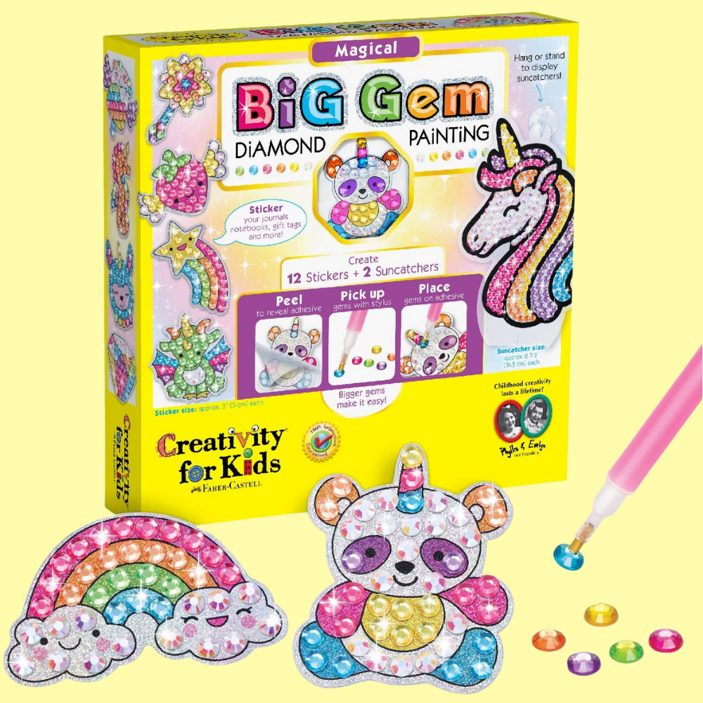 Get creative and crafty with Big Gem Diamond Painting for Kids! An ideal choice for both beginners and children, this kids craft combines two diamond painting activities into one. With 12 diamond art stickers to decorate backpacks and journals and 2 dazzling rainbow unicorn suncatchers painted with diamonds gems, this arts and crafts kit provides everything you need to create beautiful pieces of artwork in no time. Easily apply the big gems included in the set to make magical designs; it's effortless fun that any child or beginner can enjoy! If you’re searching for the perfect amateur diamond painting kit, look no further! Purchase this kids' set today and start painting with diamonds!