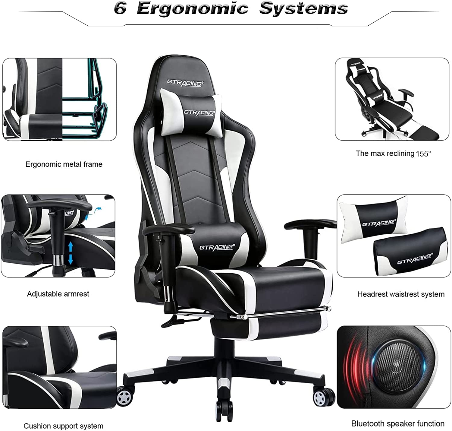 The GTRacing Gaming Chair is constructed with high-quality materials, including a strong metal frame, smooth PU leather upholstery, and a heavy-duty chair base. It also features two built-in Bluetooth speakers, allowing you to enjoy your favorite music or movies with remarkable stereo sound. The chair is adjustable, allowing you to recline up to 155 degrees and swivel 360 degrees. It also comes with a removable headrest pillow and lumbar cushion for added support. With a weight capacity of 300 lbs, the GTRacing Gaming Chair is the perfect choice for gamers of all sizes.