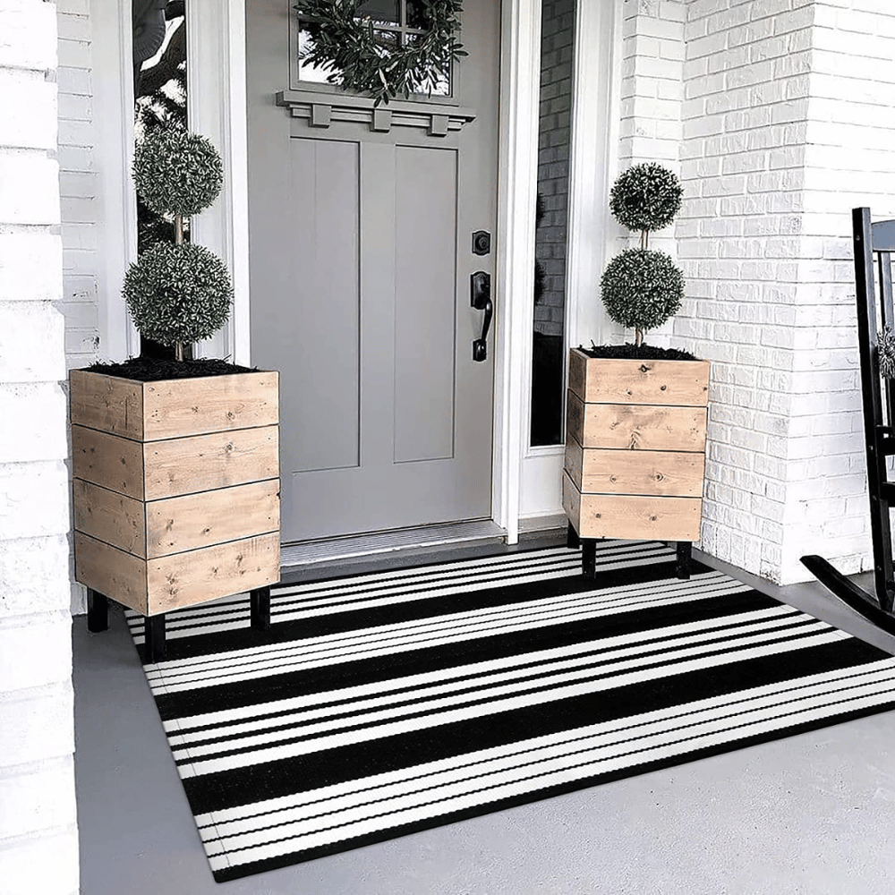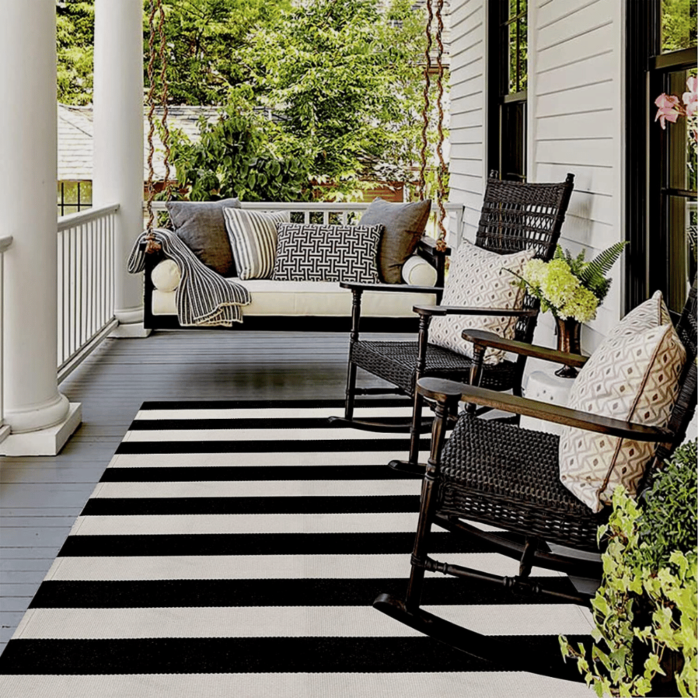 The KOZYFLY Black and White Striped Rug is a great way to add a stylish touch to your outdoor space. It is made of high-quality cotton that is soft and comfortable to touch, and it is 20% thicker and heavier than other commonly available black and white striped rugs.