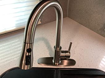 The perfect fit kitchen faucet is the perfect addition to any kitchen! This brushed gold kitchen faucet with a pull-down sprayer features an industrial kitchen faucet open spout and a 10 inches deck plate with a compact 17’’ height, so it fits easily under most cabinets. With a one-hole kitchen faucet or 3 hole kitchen faucet option, you can easily find the perfect fit for your countertop.