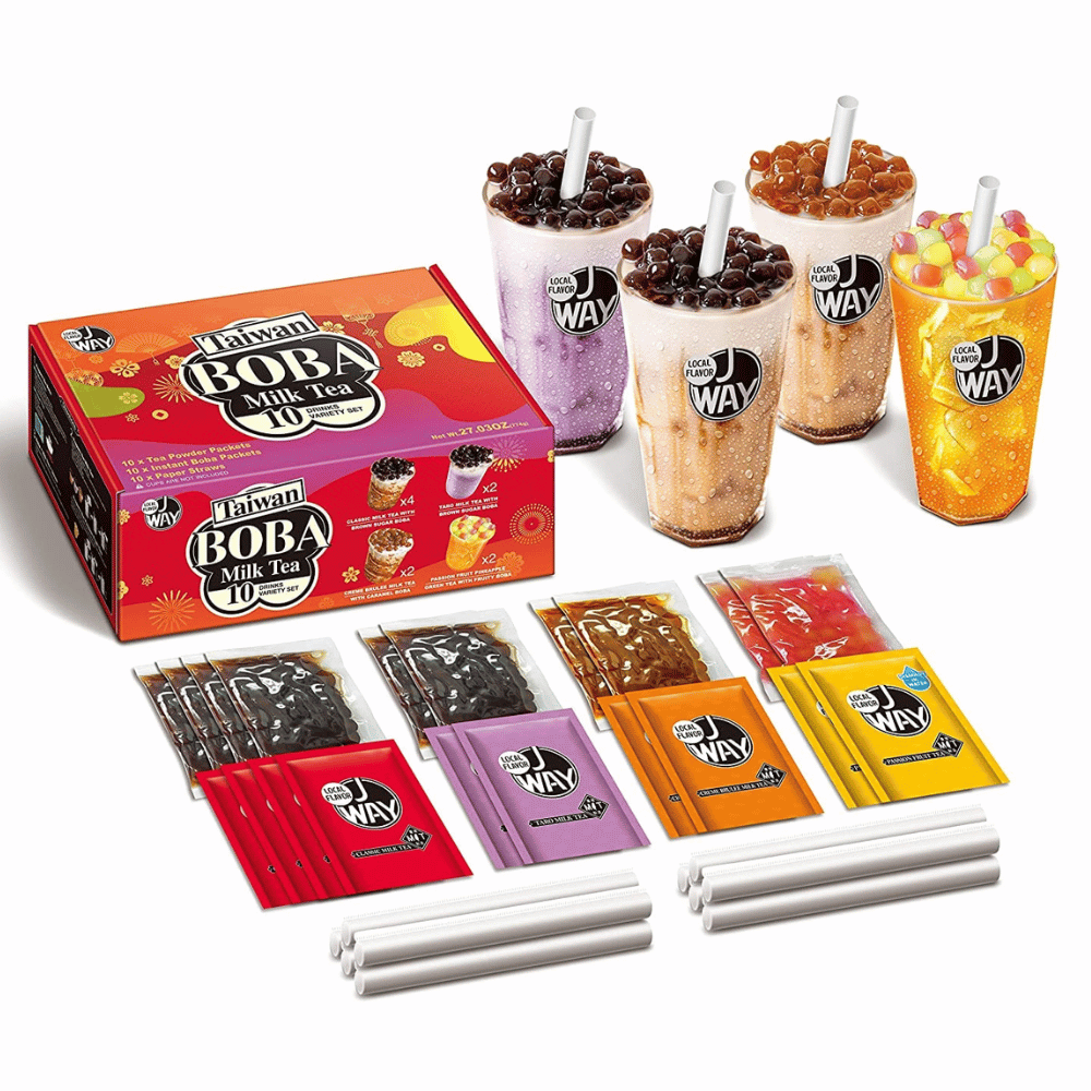 J WAY Instant Boba Bubble Pearl Variety Milk Tea Fruity Tea Kit with Authentic Brown Sugar Caramel Fruity Tapioca Boba, Ready in Under One Minute, Paper Straws Included - Gift Box - 10 Servings