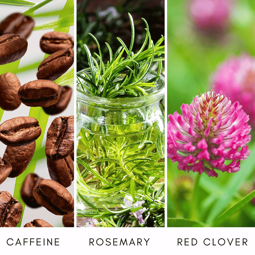It's packed with natural ingredients like caffeine, red clover, and niacin that help to promote healthy hair growth and vibrance.