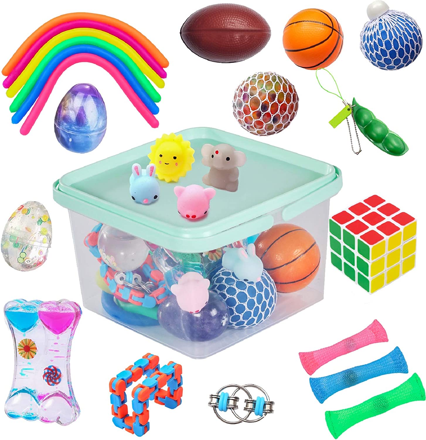 This set includes a variety of items such as squeeze grape balls, stretchy strings, basketball shape fidgets, foam balls, marble and mesh, magic cubes, flip bike chains, squeeze soybeans, Easter egg shape slime, wacky tracks, and KAWAII mochi squishy toys. All of these items come packed in a convenient transparent storage box for easy access, play and collection.